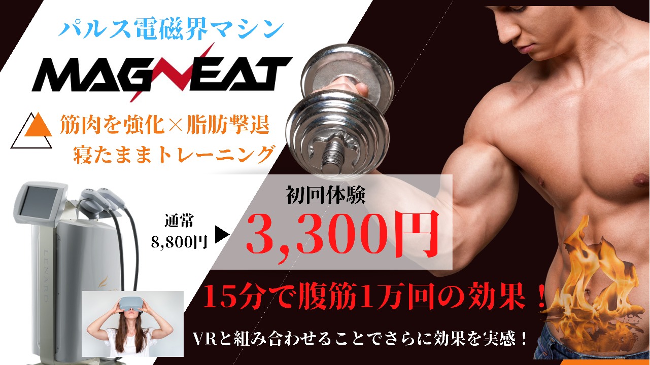 痩身 マグニート初回体験 マグニート初回体験 15分で腹筋1万回分の効果を発揮するマグニートが、通常8,800のところ「初回限定3,300円」! 筋肉を強化しつつ脂肪を撃退する寝たままトレーニングを是非この機会にご体験ください! 予約する 初回限定キャンペーン価格 パルス電磁界マシン「マグニート」 3,300円