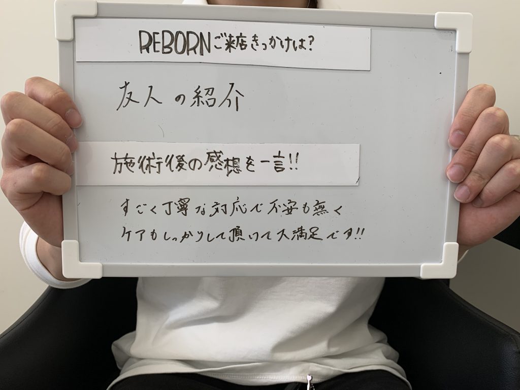 【お客様の声】Vol.2 すごく丁寧な対応&ケアで大満足! 【お店からのコメント】 脱毛でご来店のお客様です。施術後に感想を頂戴しました。 またのご来店をスタッフ一同心よりお待ちしております!! ご来店ありがとうございました! REBORNご来店のきっかけは? 友人の紹介 施術後の感想を一言!! すごく丁寧な対応で不安も無く、ケアもしっかりして頂けて大満足です!!