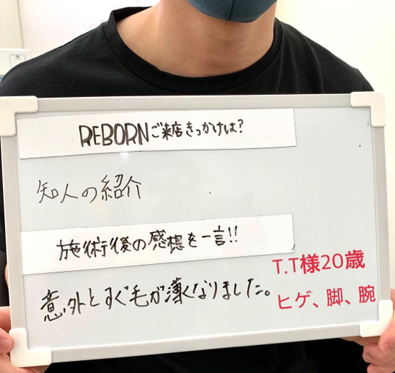 【お客様の声】Vol.5 意外とすぐ毛が薄くなりました! 【お店からのコメント】 メンズ脱毛で2度目の施術を受けていただいたお客様です。剃る回数が劇的に減ったと感動されていました! またのご来店をスタッフ一同心よりお待ちしております!! ご来店ありがとうございました! REBORNご来店のきっかけは? 知人の紹介 施術後の感想を一言!! 意外とすぐ毛が薄くなりました。